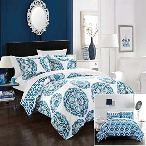 Chic Home blått, vändbart sängset i en väska, twin size (2 delar), Ibiza, medaljong boho-mönster, mikrofiber-sängkläder med geometriskt tryck, täcke och örngott