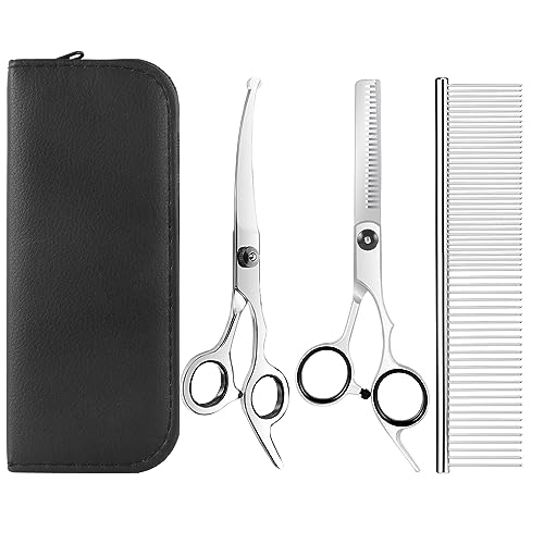 Elfirly Professionell hundtrimningssax, kit i rostfritt stål, rund spets, skärande böjd sax, uttunningssax, vård, kam, husdjurshår, trimningssax med extra sax för hundar och katter