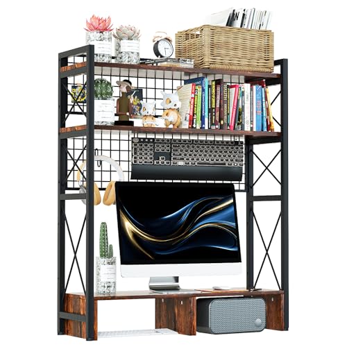 ybaymy Bokhylla för skrivbordet 90 x 74 x 24 cm justerbar i 3 våningar perfekt hyllorganiserare trä och metall monitorstativ stor för kontor hemma arbetsrum, sovsal