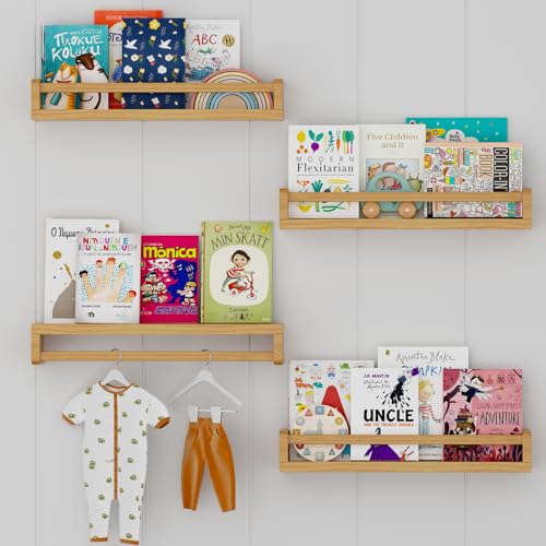 Gieanoo Bokhylla för barnkammare, uppsättning av 4 flytande hyllor, massivt naturligt trä, 40 cm bokhylla barnrum, väggmonterad, baby flytande bokhyllor, dekor för barnrum, badrum, kök