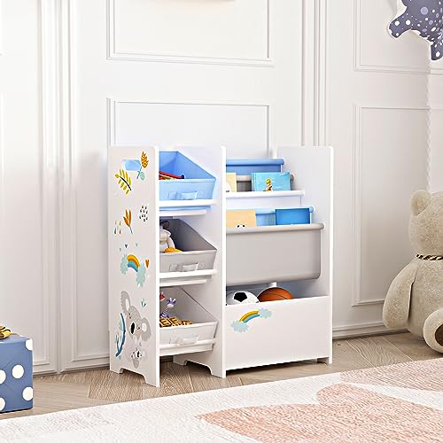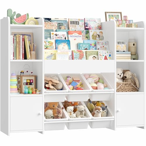 FOREHILL Leksaksförvaringsenhet barnbokhylla barnförvaring barnbokhylla leksaksarrangör med 6 avtagbara lådor, bokhylla i 4 nivåer för barnkammare, lekrum, 119 x 29,5 x 94 cm, vit