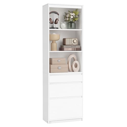 FirFurd Bokhylla med 3 lådor, 3 fack, 180 cm, högskåp, bokskåp, vitrinskåp, multifunktionskåp för vardagsrum, kontor, kök, 60 x 35 x 180 cm, vit