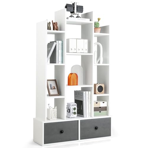 Fantas Bokhylla i trädform, stående hylla med lådor, hylla med 12 fack, förvaringshylla för vardagsrum, sovrum, 53 x 24 x 118 cm (vit)