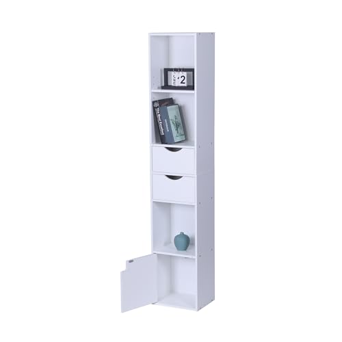 WOLTU Bokhylla bokskåp stående hylla förvaringshylla kontorshylla, med 6 hyllor 2 lådor 1 dörr, gjord av trämaterial, för vardagsrum sovrum kontor, vit, SK042ws