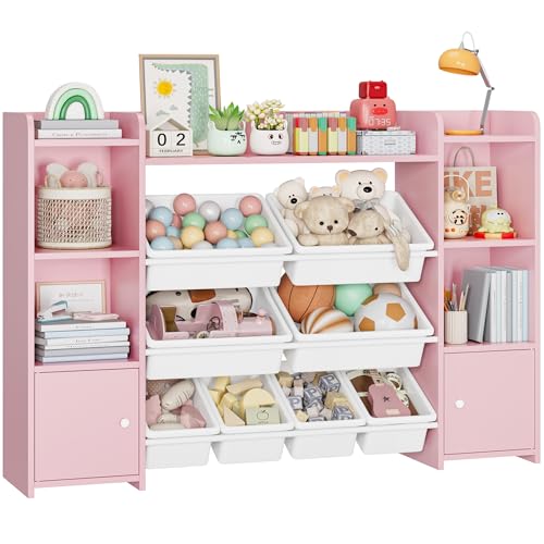 Forehill Barnhylla med 8 lådor, barnskåp, trä, bokhylla med förvaringslåda, för barnrum, möbel med leksakslåda, 138,8 x 94,3 x 29,6 cm (rosa)