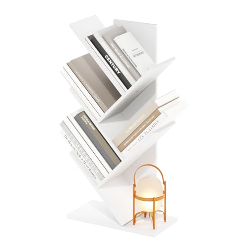 Meerveil Bokhylla, träd bokhylla 8 nivåer trä fristående hyllor för CD-skivor tidskrift i vardagsrum hemmakontor vit, 40 x 127 x 20 cm
