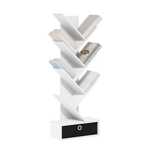 Furinno Träd bokhylla 7 nivåer golvstående träd bokhylla med låda, vit/svart