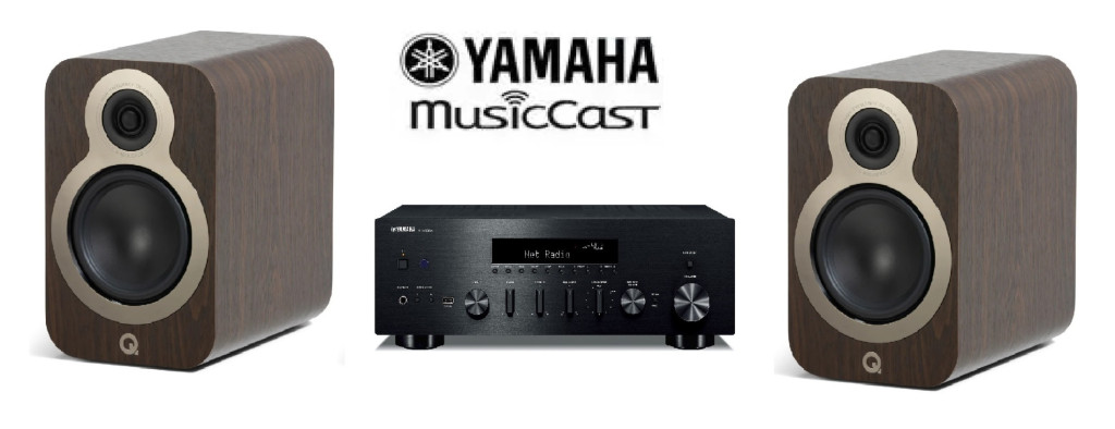 Yamaha WiFi Stereopaket High-Power bokhylle högtalare Silver Förstärkare med valnöt högtalare