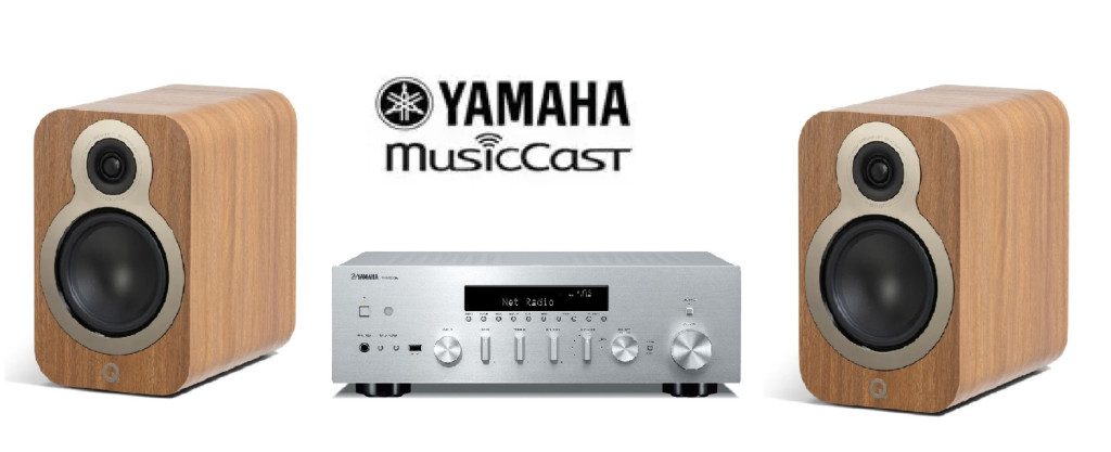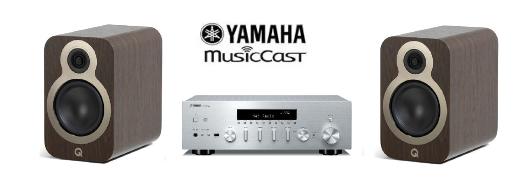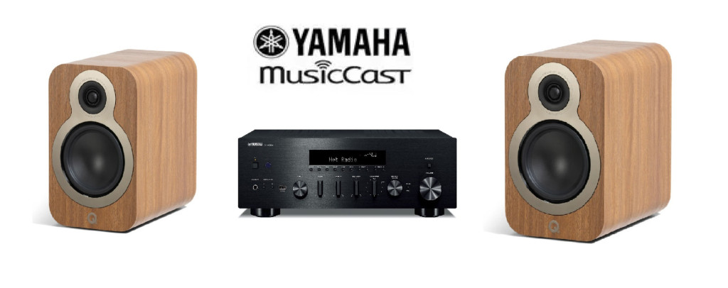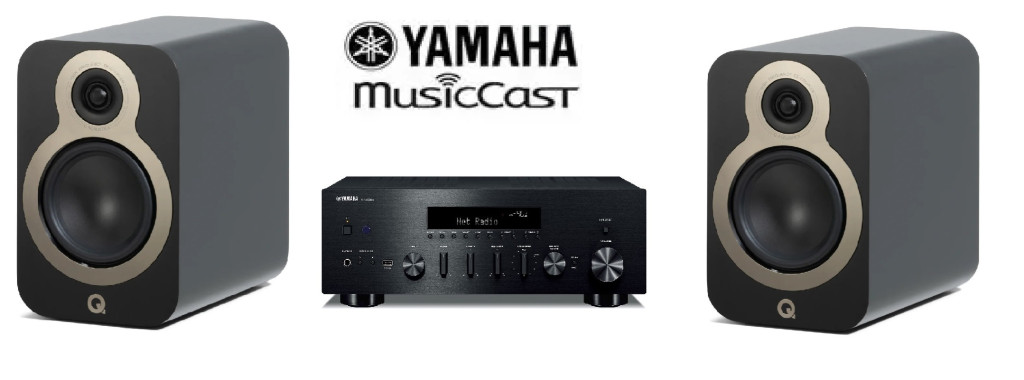 Yamaha WiFi Stereopaket High-Power bokhylle högtalare Silver förstärkare med svarta Högtalare