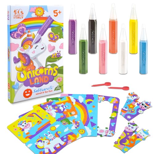 Sabbiarelli Sand-it For Fun - Kit Enhörningarnas Land, Kreativt Sand Art-Set för Barn 5+: 8 Pennor med Färgad Sand och 6 Självhäftande A5-Ark med 8 Motiv, 4 Bokmärken och 1 Ram med Enhörningstema