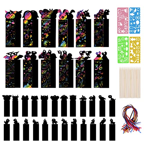 Vicloon Scratch Art-bokmärken, 36 st Rainbow Scratch-bokmärken Gör-det-själv-presentetiketter med 36 band och 18 träpennor, bokmärkesset för barn med 4 ritstenciler Skolklassrumsfestfavorit
