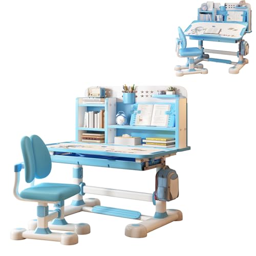 Yoakaiax Set med skrivbord och stol, justerbar höjd med sittande korrektor, ergonomisk stol med bokstativ, fotpedal blå