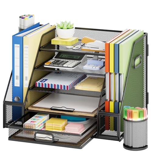 Marbrasse Skrivbordsorganiseringsbricka,5-Nivås Pappersbrevfack,Organiserare med låda,2 Pennhållare,nät,Skrivbordsorganiserare,Tillbehör,Förvaring för Hemmakontor (Svart bilateralt bokstativ)