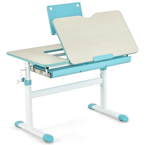 COSTWAY Barnskrivbord 51–73 cm höjdjusterbart, skolskrivbord med lutbar bordsskiva, bokstativ, låda och linjal, ergonomiskt ungdomsskrivbord för 3–12 år barn (blå)