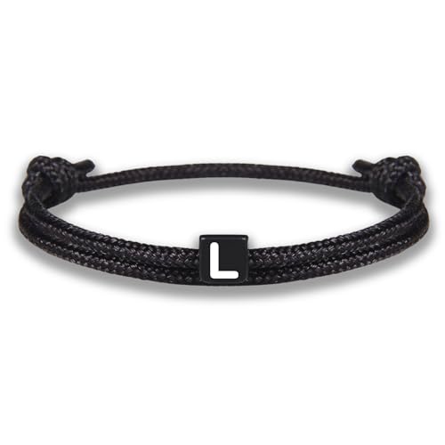GD GOOD.designs armband med bokstaven L | Justerbart armband för par (14 cm - 25 cm) med svart flätat snöre - Present till henne och honom