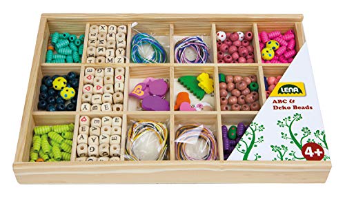 Lena 32024 – pysselset, trätrådspärlor stora och trätrådbokstäver i träkassett, pärlset med över 400 delar, trådpärlor av trä, träpärlor set för barn från 4 år, med bokstäver pärlor