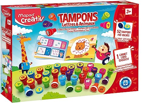 Joustra Maped Creative – bokstäver och djur, kreativ fritid för barn från 3 år, 52 stämplar, 1 lärhäfte och 6 filtpennor, tvättbart bläck, J41577, flerfärgad