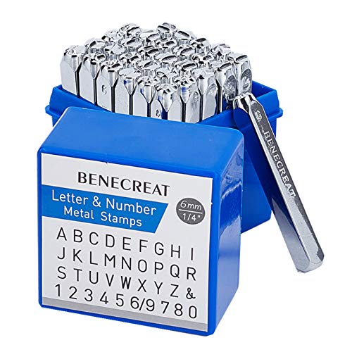 BENECREAT 36 st 6 mm (1/4 tum) metallstämpelset med bokstäver och siffror, stämplar i galvaniserat kolstål med A-Z, 0-8, ”&” för prägling på metall, trä, läder
