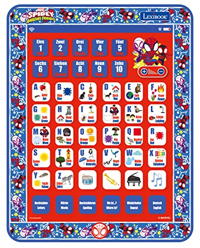 Lexibook, Spidey & hans supervänner, pedagogisk tvåspråkig inlärningsbricka, leksak för att lära sig alfabetet bokstäver siffror ord stavning musik, engelska/tyska, JCPAD002SPi3