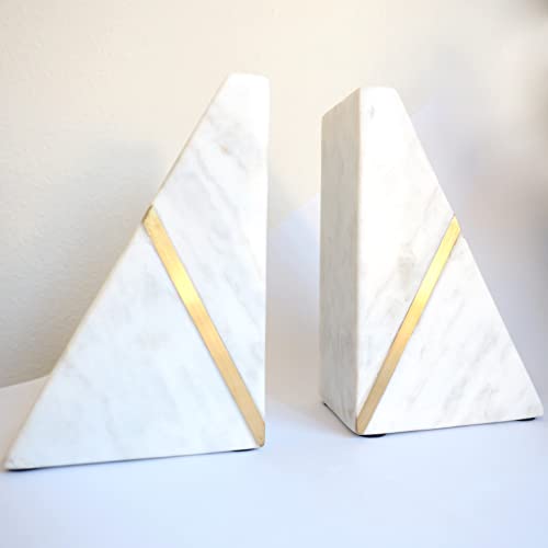 Marmor bokstöd handgjord tung marmor triangulär bokhylla dekor mässingsinlägg set med 2 dekorativa bokstöd bokstoppare med halkfri botten massivt hem kök kontorshyllor triangel