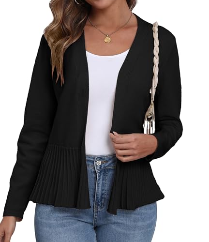 GRECERELLE Kofta dam med veckad fåll lätt långa ärmar cardigan dam kort elegant avslappnad öppen front bolero cover up, svart, M