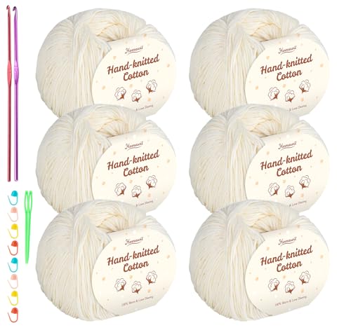 Bomull beige 6, 100 % bomullsgarn för baby supermjuk barnmjölk virka och stickgarn – (50 g/boll) med 2 metallvirkade krokar (2,5–3,5 mm) baby fluffig boll för handstickning garn