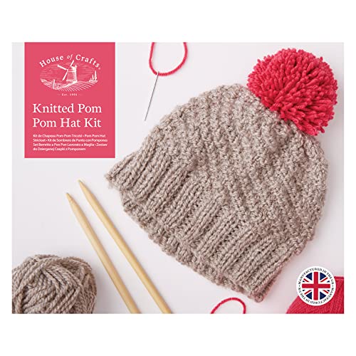 House Of Crafts stickad pom-hatt, enkel hantverkssats set, flerfärgad, inkluderar 100 g boll tjock akrylull, 50 g boll av akryl baby DK ull, bambu sticknålar, synål