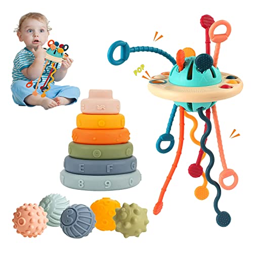 Jokooan Montessori Leksaker 3-i-1, Aktivitets STEM Multi-sensorisk baby Utbildning Spel 1, 2 och 3 år Gammal, Silikon Rep Spel + Form Matchande Stapelbar Leksak + Silikon Boll()