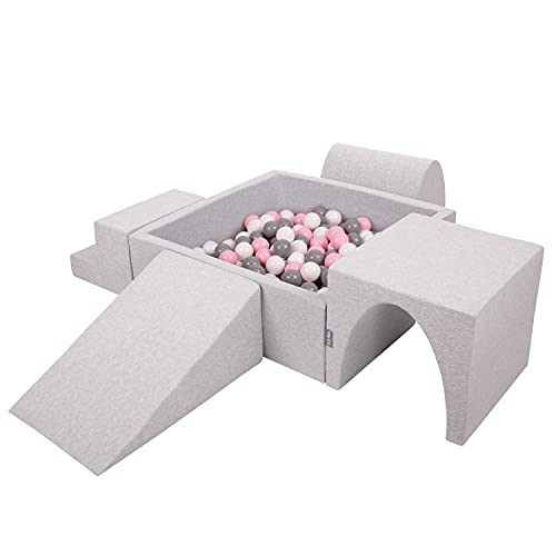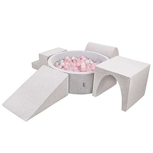 KiddyMoon Skumlekplats för barn med kvartal vinklad bollhav (100 bollar) hinderbana, ljusgrå: pulverrosa/pärla/genomskinlig