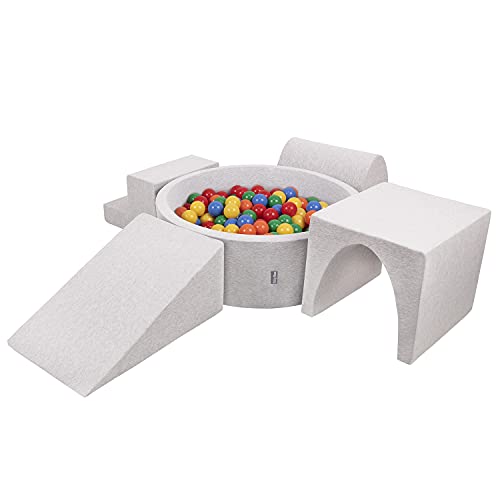 KiddyMoon skumlekplats för barn med runt bollhav, (200 bollar) hinderbana, ljusgrå: gul/grön/blå/röd/orange