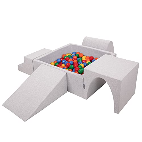 KiddyMoon Skumlekplats för barn med fyrkantigt bollhav (300 bollar), ljusgrå: gul / grön / blå / röd / orange
