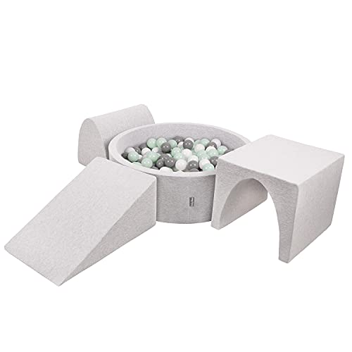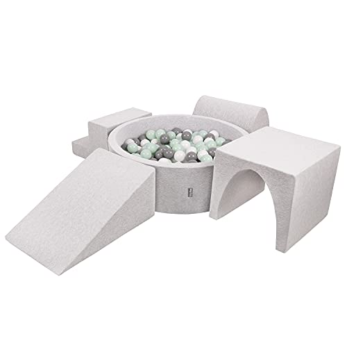 KiddyMoon skumlekplats för barn med runt bollhav, (200 bollar) hinderbana, ljusgrå: vit/grå/mint