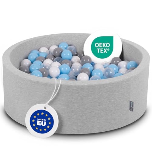 KiddyMoon Bollhav på 90 x 30 cm, med 200 bollar med en diameter på 7 cm, bollpool med färgglada bollar för spädbarn och barn, rund, ljusgrå: grå/vit/transparent/babyblå