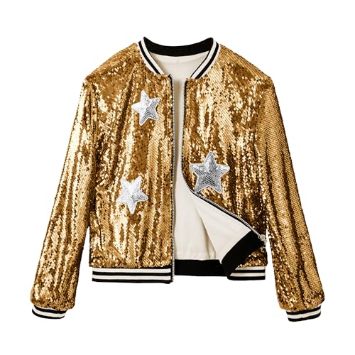 LOLANTA Bomberjacka med paljetter och fickor, dragkedja, långärmad glitter, baseballjackor för barn 4–13 år, Guld, 11-12 År