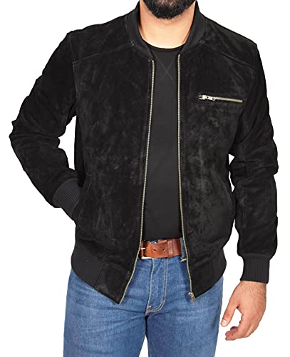 Herr äkta mocka bomberjacka anpassad klassiska färger svart brun marinblå solbränd, Svart, M