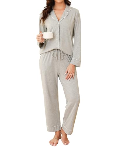 Reliwel Pyjamas-set för kvinnor bomull dam pyjamas knäppt långärmad nattkläder vinter tvådelad andningsbar mjuk bekväm, Ljusgrå, XL