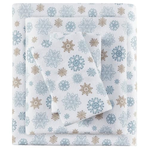 True North by Sleep Philosophy Mysig flanell varmt 100% bomullslakan - nyhetstryck djur stjärnor söt ultramjuk kallt väder sängkläder set, tvilling, solbränt/blå snöflingor 3 delar