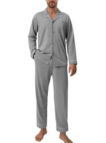 DAVID ARCHY Långärmad bomullspyjamas för män och byxor med fickor, mjuka och bekväma, Medium grå, S