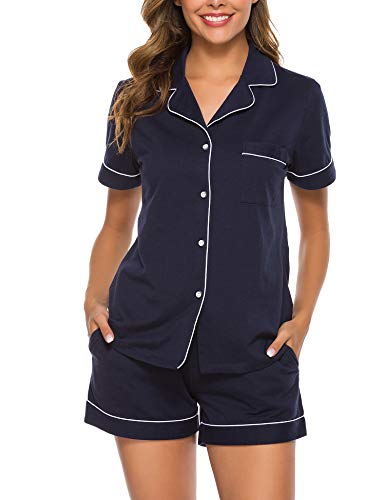 COLORFULLEAF Dam 100% bomullspyjamas kort set mjuk kortärmad nattkläder button down sommar pyjamasset med fickor S-XXL, A1_marinblå, L