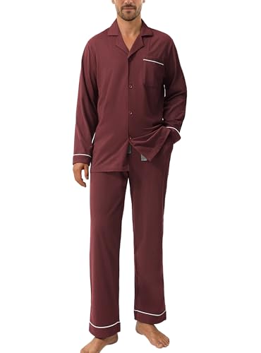 DAVID ARCHY Långärmad bomullspyjamas för män och byxor med fickor, mjuka och bekväma, Rött lönnlöv, M