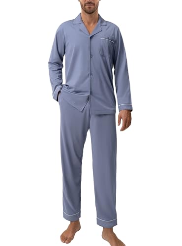 DAVID ARCHY Långärmad bomullspyjamas för män och byxor med fickor, mjuka och bekväma, Blå-grå-lila, XL