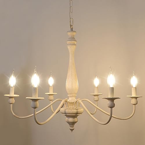 LynPon Bondgård i trä ljuskrona nödställd vit fransk lantlig industriell lampa tak 6 ljus vintage rustik retro hängande belysning för matsal vardagsrum sovrum