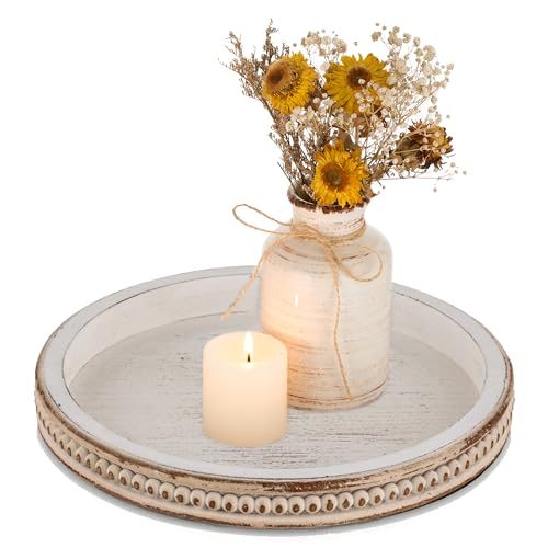 Bondgård Träbricka, dekor, ljushållare – Romadedi-pärla, rund dekorativ bricka i trä för soffbord, serveringsbrickor, köksbänk, rustik mittpunkt för vardagsrum, heminredning, vittvättad
