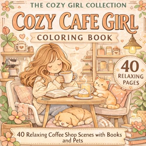 Cozy Cafe Girl Coloring: 40 Relaxing Coffee Shop Scenes with Books and Pets