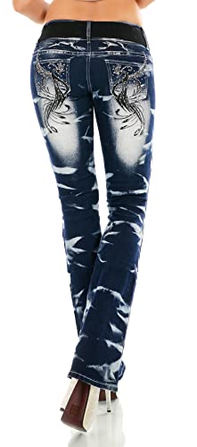Dam, bootcut jeans, byxor, utsvängda jeans, olika broderi, tatuering, drake, bukett, bokstäver inkl. Bälte XS–XXL, 44