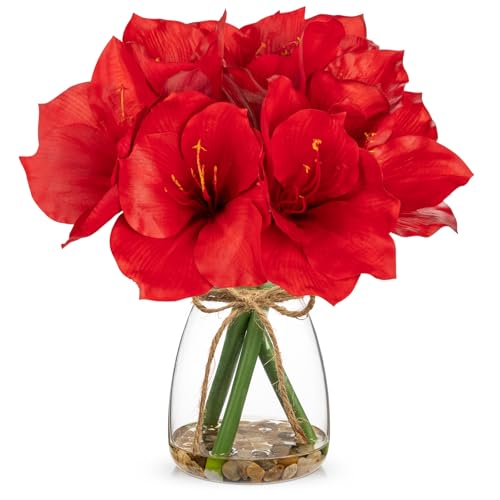 Arborus Konstblommor i vas, 30 cm, röda, konstgjorda Amaryllis blommor med glasvas, fuskvatten, småsten, äkta beröring, vårblommor för hem, badrum, bord, bordsuppsats, bröllopsfest dekorationer