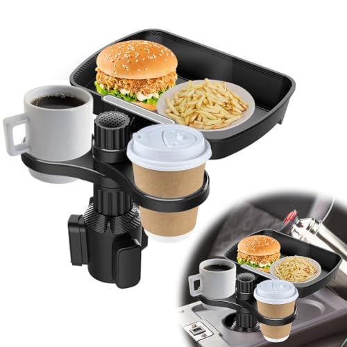 Kayuneed Bilmugghållare bord bricka, 3-i-1 mugghållare, biladapter med mobiltelefonhållare och avtagbar matbricka, 360° justerbart bilbord för vattenflaskor, dryckesmellanmål
