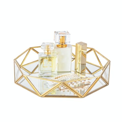 Feyarl Guld Glas Speglad Bricka för Parfym, Smink, Smycken - Utsmyckad Kosmetisk Organiseringsbricka - Dekorativ för Heminredning, Byrå, Bord (24 cm/9,5 tum)