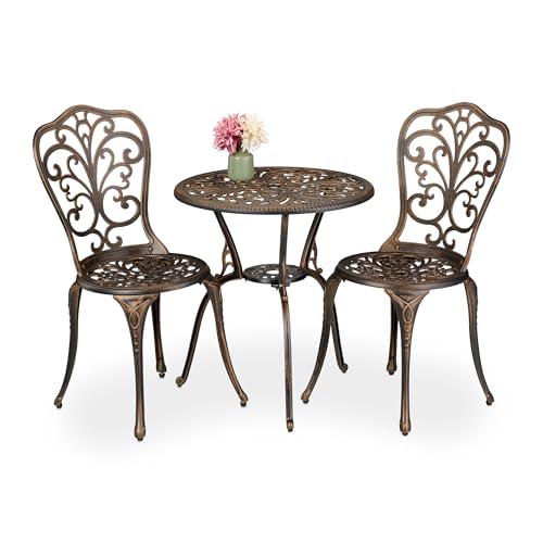 Relaxdays trädgårdsmöbler set 3 delar, bord, 2 stolar, gjuten aluminium, balkongmöbler antik design, trädgård sittgrupp, svart/brons