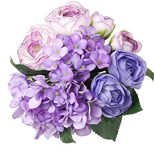 Felice Arts 30 cm konstgjorda blommor lila bukett med 7 huvuden silke te ros och hortensia bukett för hem vas bröllop brud bukett kontor fest bord bordsuppsats gör-det-själv dekor